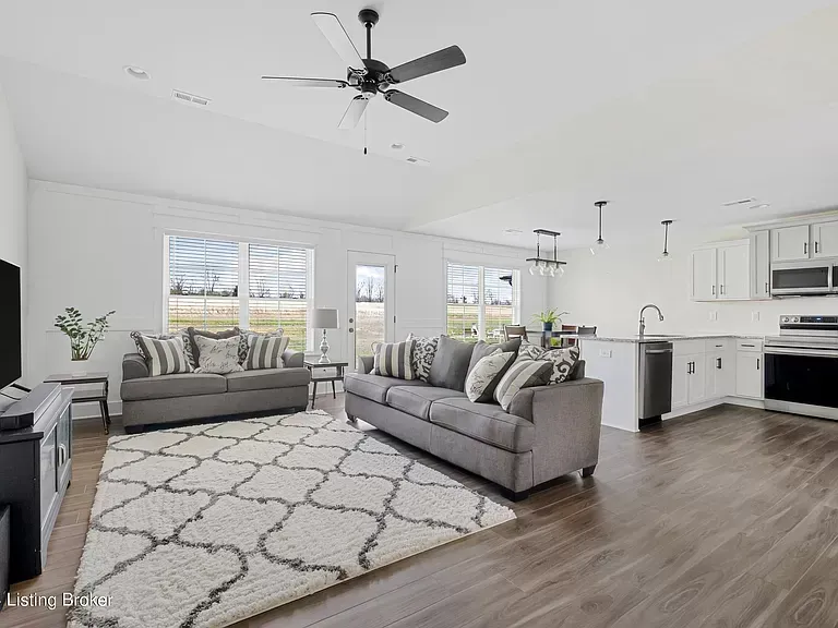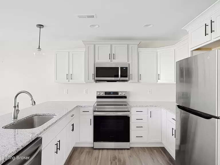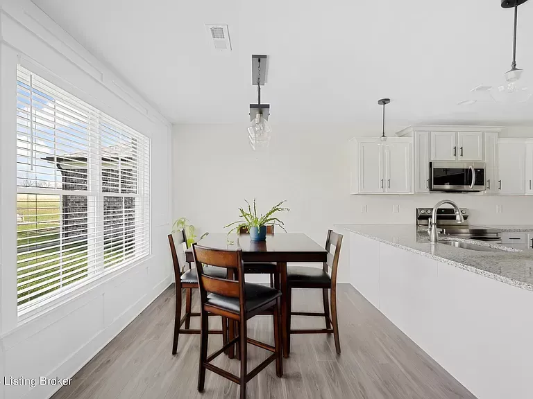 As you enter the front door and through the entryway, you'll be greeted by a spacious and inviting living area, with vinyl flooring, wall trim detail and 10ft ceilings. The open floor plan carries you into the kitchen where you'll find upgraded two-toned shake cabinets, stainless steel appliances and granite countertops.